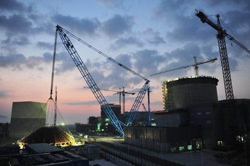 2013年11月23日,浙江三門核電站1號機組順利完成了核島廠房穹頂吊裝。經過數小時的吊裝和調整,起吊總重量達922噸的穹頂,穩穩地就位在52米高的圓筒體結構的核島屏蔽墻。核島屏蔽廠房穹頂就位是一個重大里程碑節點,標志著我國三代核電自主化依托項目、世界首批AP1000機組建設總體進展順利,首臺機組進入“收官”階段。